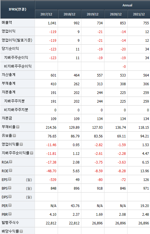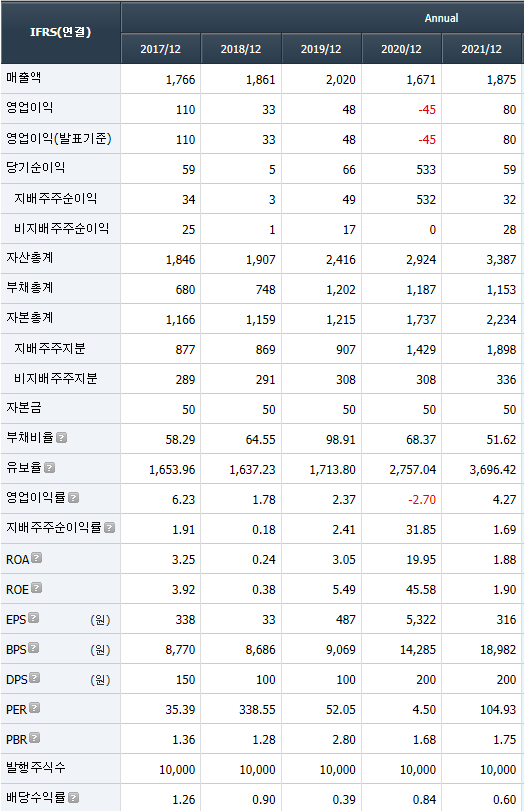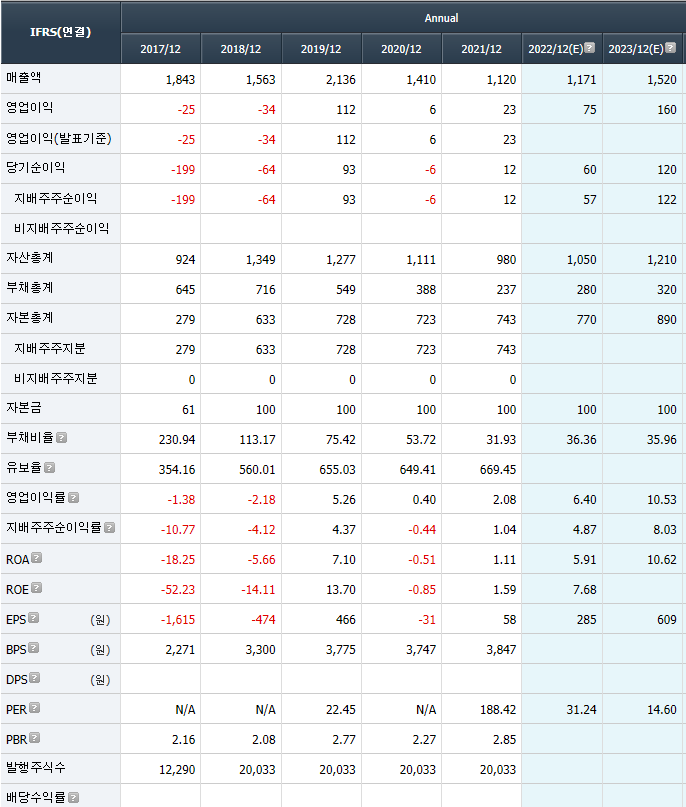 - 2021년 12월 전년동기 대비 연결기준 매출액은 20.6% 감소, 영업이익은 310% 증가, 당기순이익 흑자전환. 패션사업이 온라인으로 전환하며 오프라인 매출이 감소한 것이 악영향을 미쳤음. 여기에 포장사업부문은 코로나19에 따른 글로벌 락다운이 악재로 작용하며 부진함. 다만 궁중비책 사업에서 코로나19 타격으로 축소되었던 면세채널 매출이 개선되고 중국 등 해외 수출이 반등하며 영업이익이 개선됨.