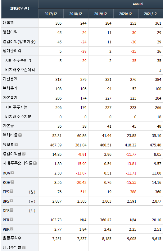 - 2021년 12월 전년동기 대비 연결기준 매출액은 42.7% 증가, 영업이익 흑자전환, 당기순이익 흑자전환. 온라인 쇼핑몰은 자사몰의 경우 중간수수료가 발생하지 않아 순이익 창출에 긍정적인 영향을 주는 판매경로로, 온라인 시장 확대할 계획임. 동사의 연결 기준 2021년 매출액은 전년 대비 42.69% 상승한 361억원, 영업이익은 전년 대비흑자전환한 29억원 달성함.