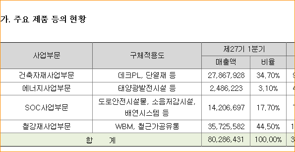 - 동사는 FFU/EFU, 클린룸 및 공조시스템, 드라이룸 등 제조, 설치공사를 취급하는 클린환경 사업부문, 태양광 관련 제품, 시스템 및 상품과 관련된 재생에너지 사업부문을 영위함. 동사의 클린룸 사업은 클린룸 전체 설비 중에서 공기정화설비에 관련된 사업이며, 일반 빌딩 및 공장에 대한 공조 장비 제조 및 설치공사, 이차전지 생산시설의 드라이룸 등을 포함. 동사의 기타 사업부문에는 임대, 용역, 서비스 사업이 있음.
