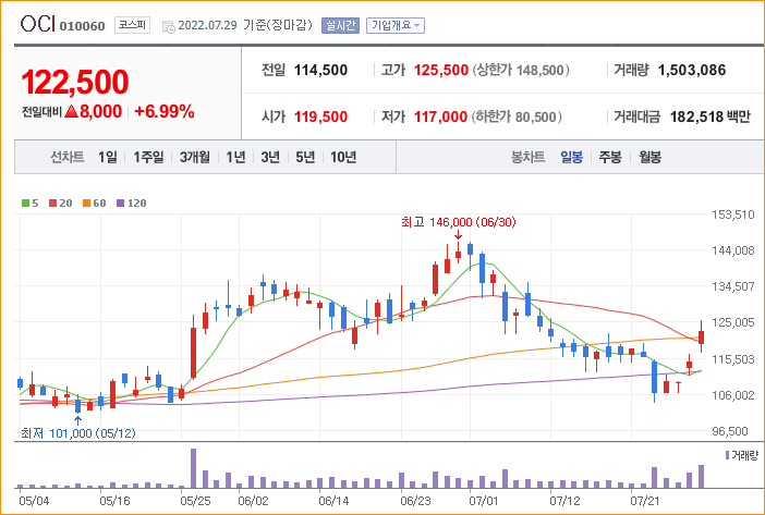 - 2022년 3월 전년동기 대비 연결기준 매출액은 75.4% 증가, 영업이익은 244.6% 증가, 당기순이익은 253.9% 증가. 말레이시아 소재의 종속회사인 OCIM Sdn. Bhd.는 폴리실리콘 생산능력을 현재 연간 3만톤에서 2022년 연중 3만5천톤으로 확대하기 위해 생산공정개선을 진행 중. 종속회사 DCRE는 안천 미추홀구의 역대 최고 경쟁률을 기록하는 등 흥행에 성공.