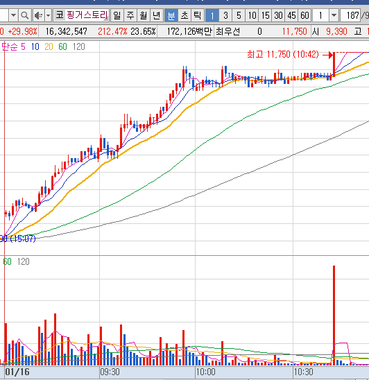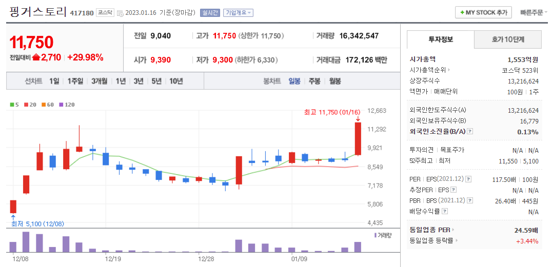 라이센스뉴스 = 임이랑 기자 | 핑거스토리의 주가가 강세를 보이고 있다.16일 오후 1시 21분 기준으로 핑거스토리의 주가는 전일대비 29.98%(2710원)이 오른 1만1750원에 거래되고 있다.핑거스토리의