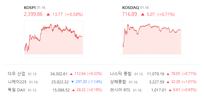 코스피 지수는 16일 장중 2400선을 넘었지만 막판 상승분을 반납하며 2399선에 마감했습니다.
