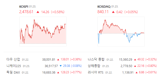 23일 코스피 지수는 전거래일 대비 14.26포인트(0.58%) 오른 2478.61에 마감했습니다.