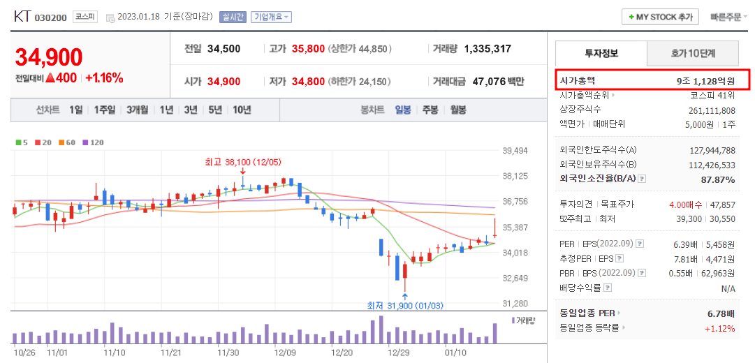 KT의 경우 시가총액이 9조 가량 되어 상승폭이 제한적입니다.