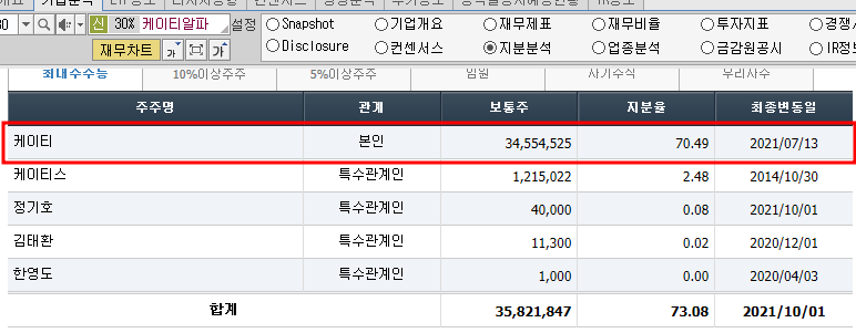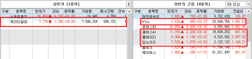 케이티알파는 케이티측 지분 70%를 보유중이며, 시가총액과 테마주에 부합해 상한가에 진입하였습니다.