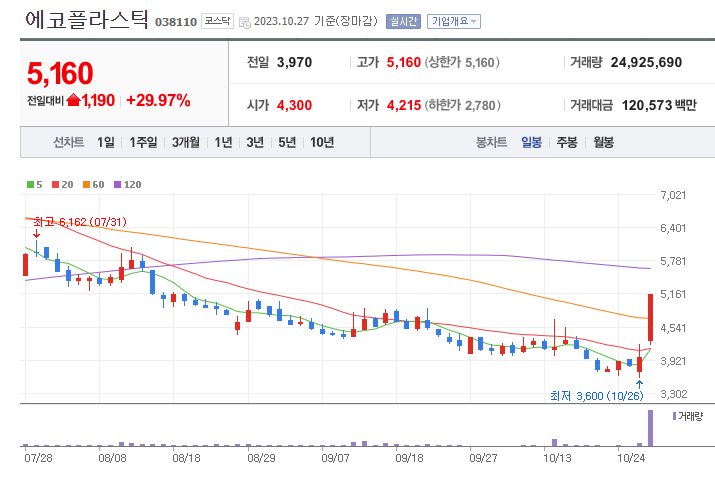 어제 역대 최대 실적기대감이라는 뉴스로 바닥권에서 양봉을 만들고 오늘도 다시 한번 상한가를 가는 강한모습을 보여줬습니다. 에코플라스틱이 계속 강한 모습을 보이자, 자동차부품 섹터들도 돈이 조금씩 들어오는 모습을 보이면서, 지수가 반등할때 자동차섹터쪽에도 힘이 실릴수있을지가 관건인거 같습니다.