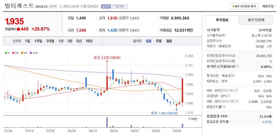 알티캐스트는 차지인 지분 16.67%를 보유하고 있는 최대주주 소식에 상한가에 진입하였습니다.