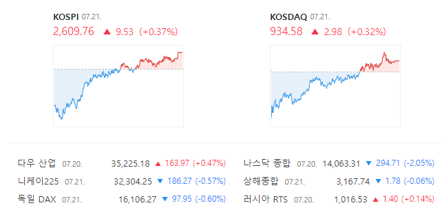 21일 코스피는 전날 대비 9.53p(0.37%) 상승한 2609.76에 거래를 마쳤다.