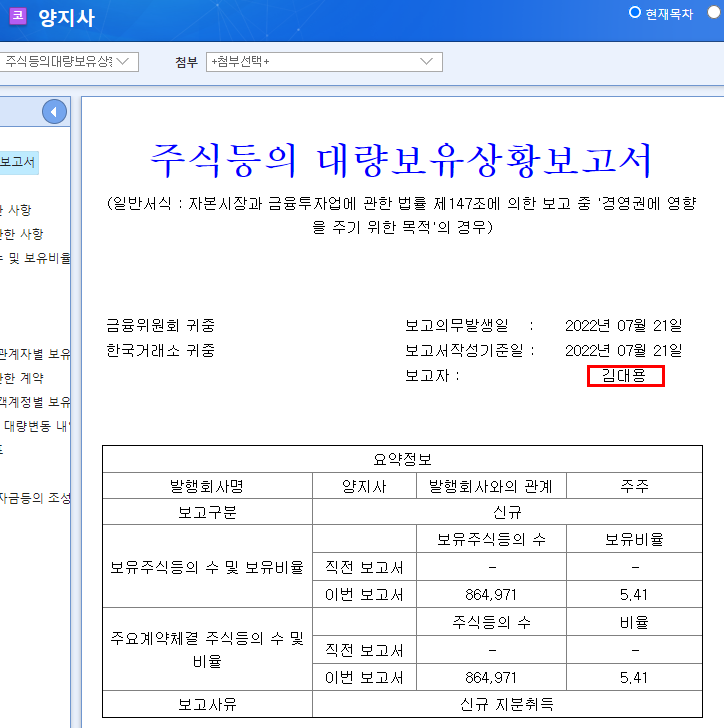 이번에는 양지사에 지분신고를 하였고 5%가량 지분을 매수하였네요