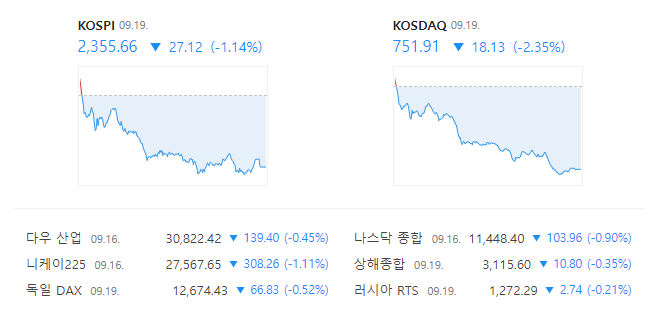 19일 코스피는 전 거래일 대비 27.12포인트(1.14%) 내린 2355.66에 장을 마쳤습니다. 이날 5.95포인트 상승 출발한 지수는 개장 후 5분여만에 하락 전환한 뒤 하락폭을 키워 마감했습니다.